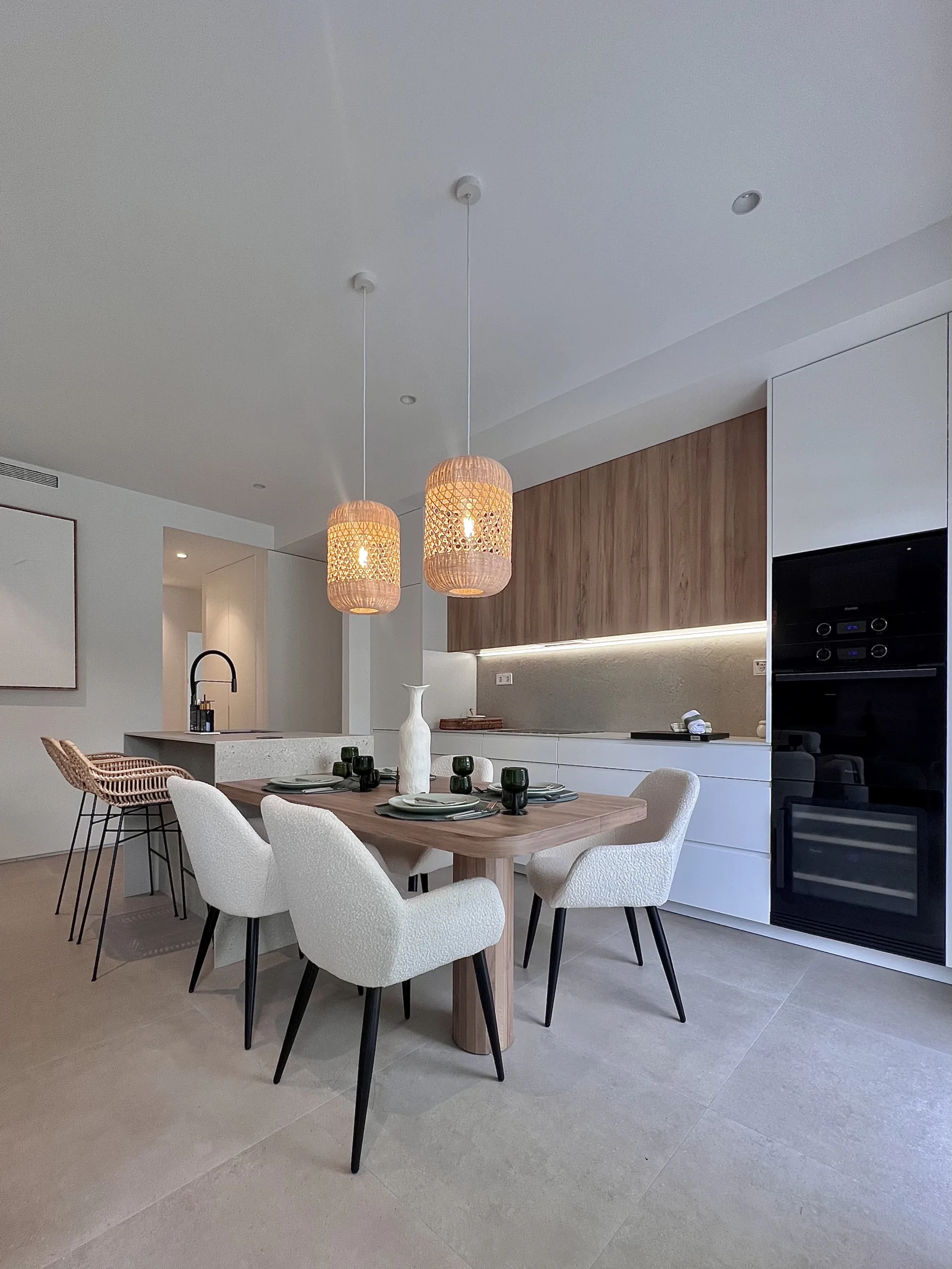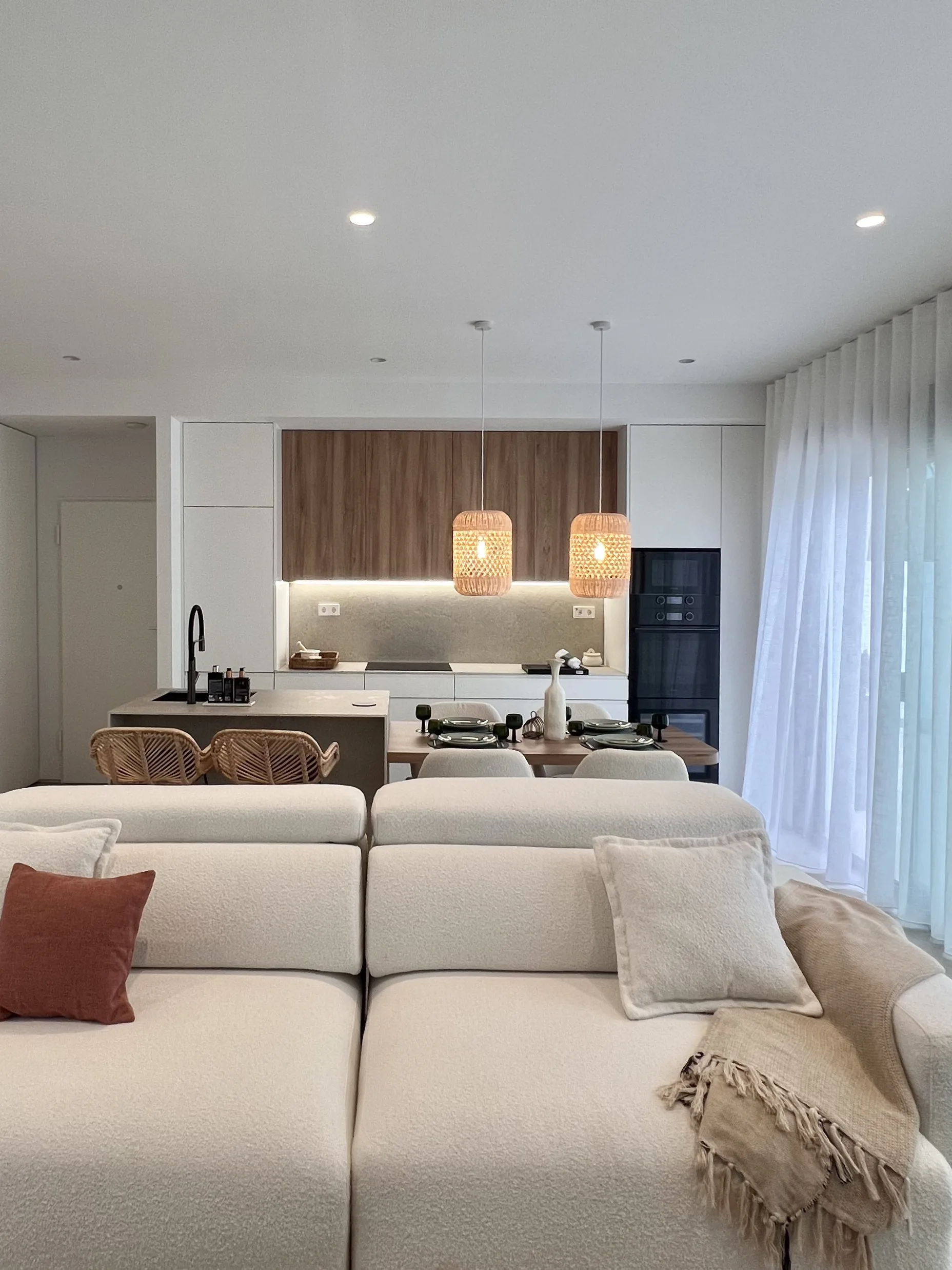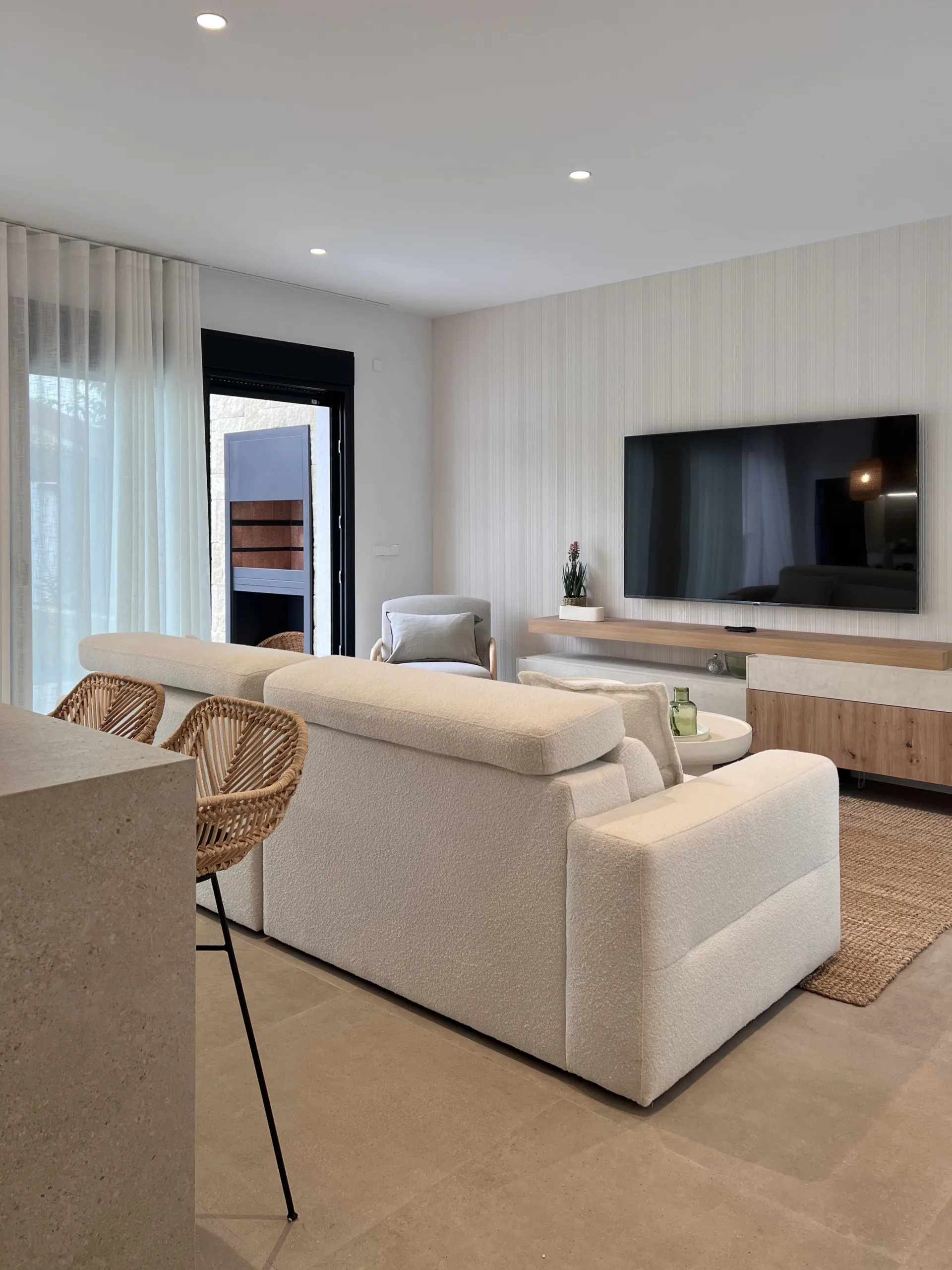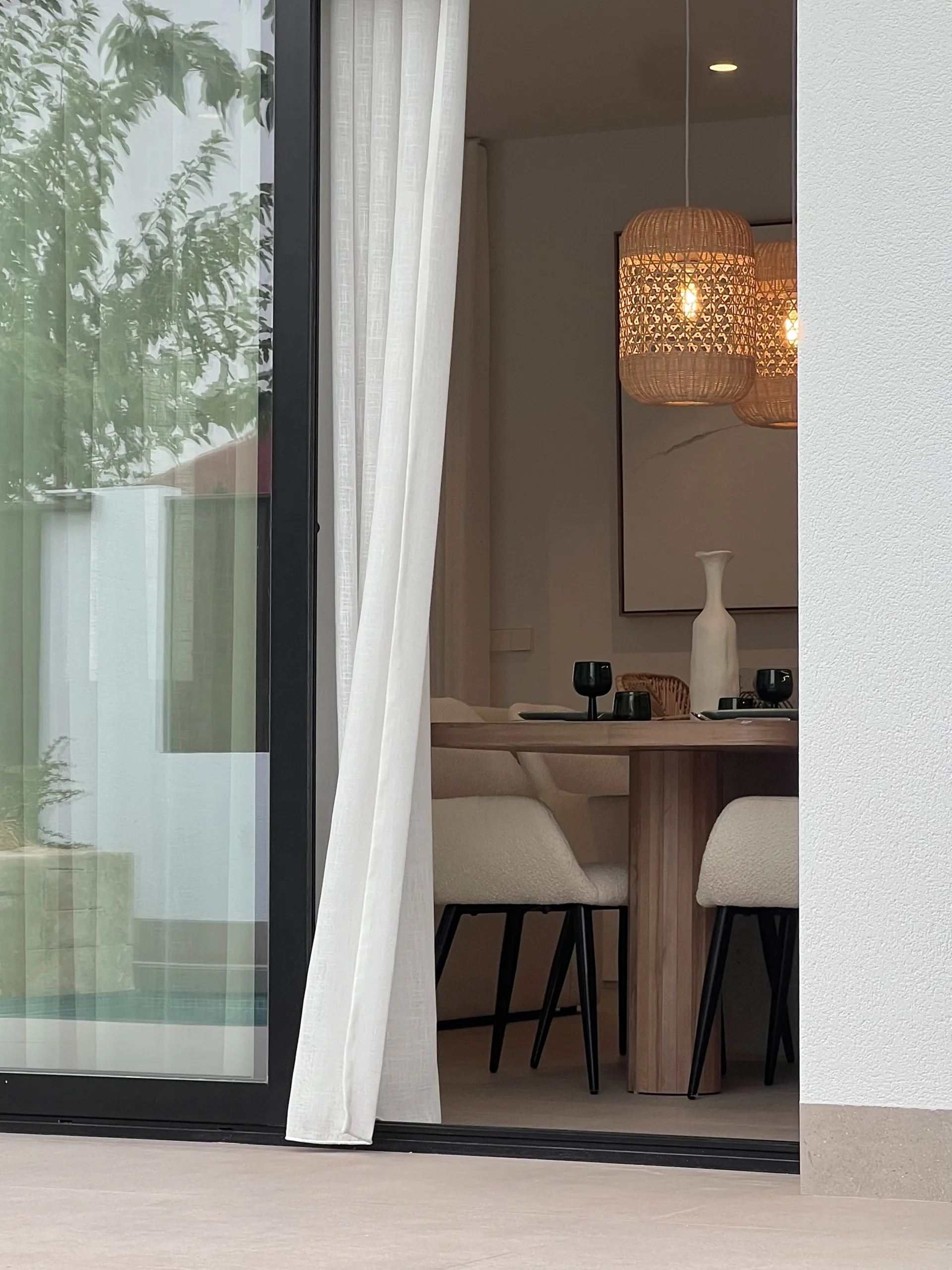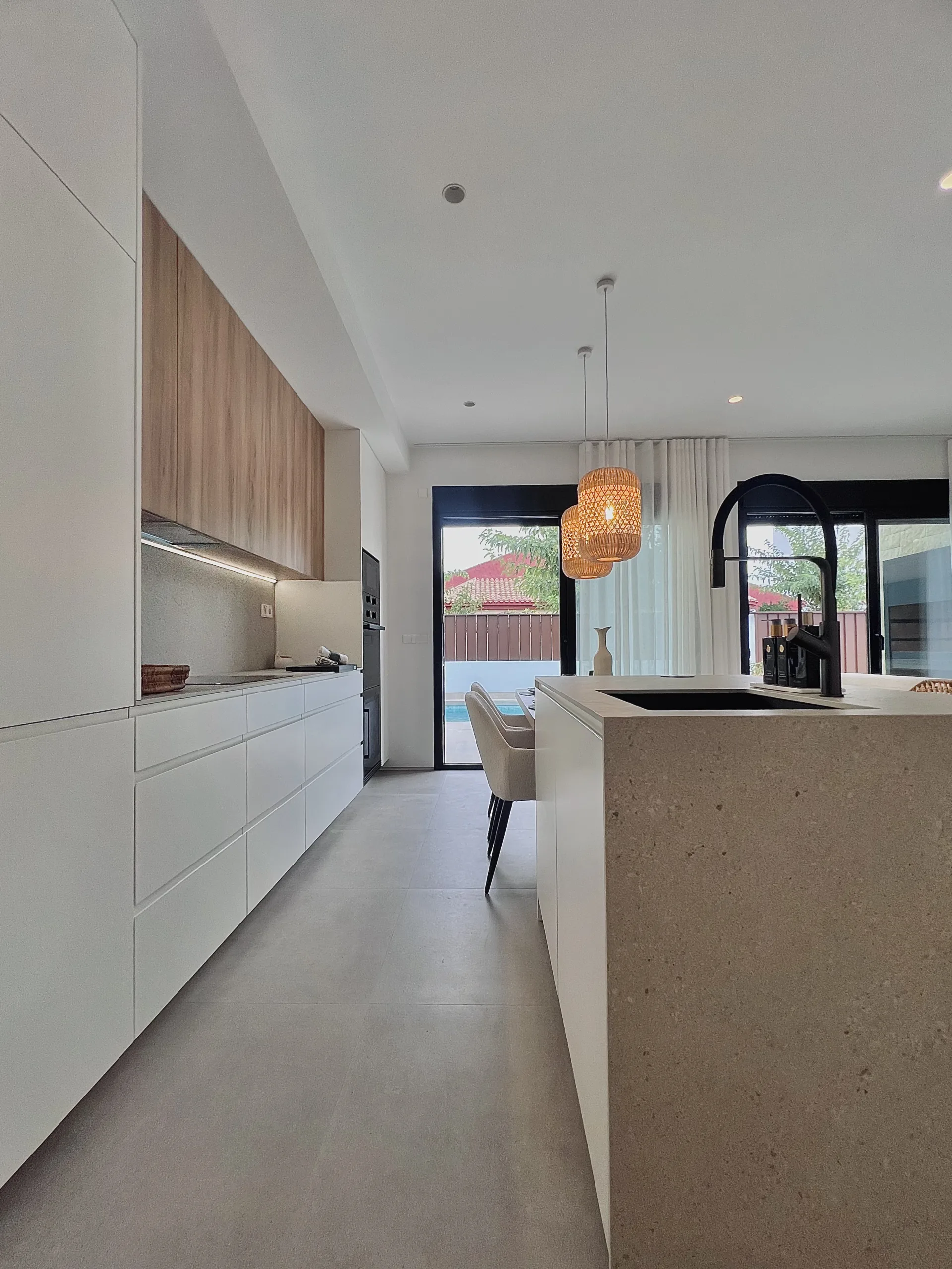 Cada villa se abre hacia una parcela amplia y privada, donde la piscina, la vegetación y los elementos pétreos componen un escenario íntimo y sofisticado. La casa se vive de dentro hacia afuera, y de fuera hacia dentro: cocinas con isla que se convierten en punto de encuentro, salones que dialogan con el paisaje y espacios exteriores que invitan a celebrar cada instante.
