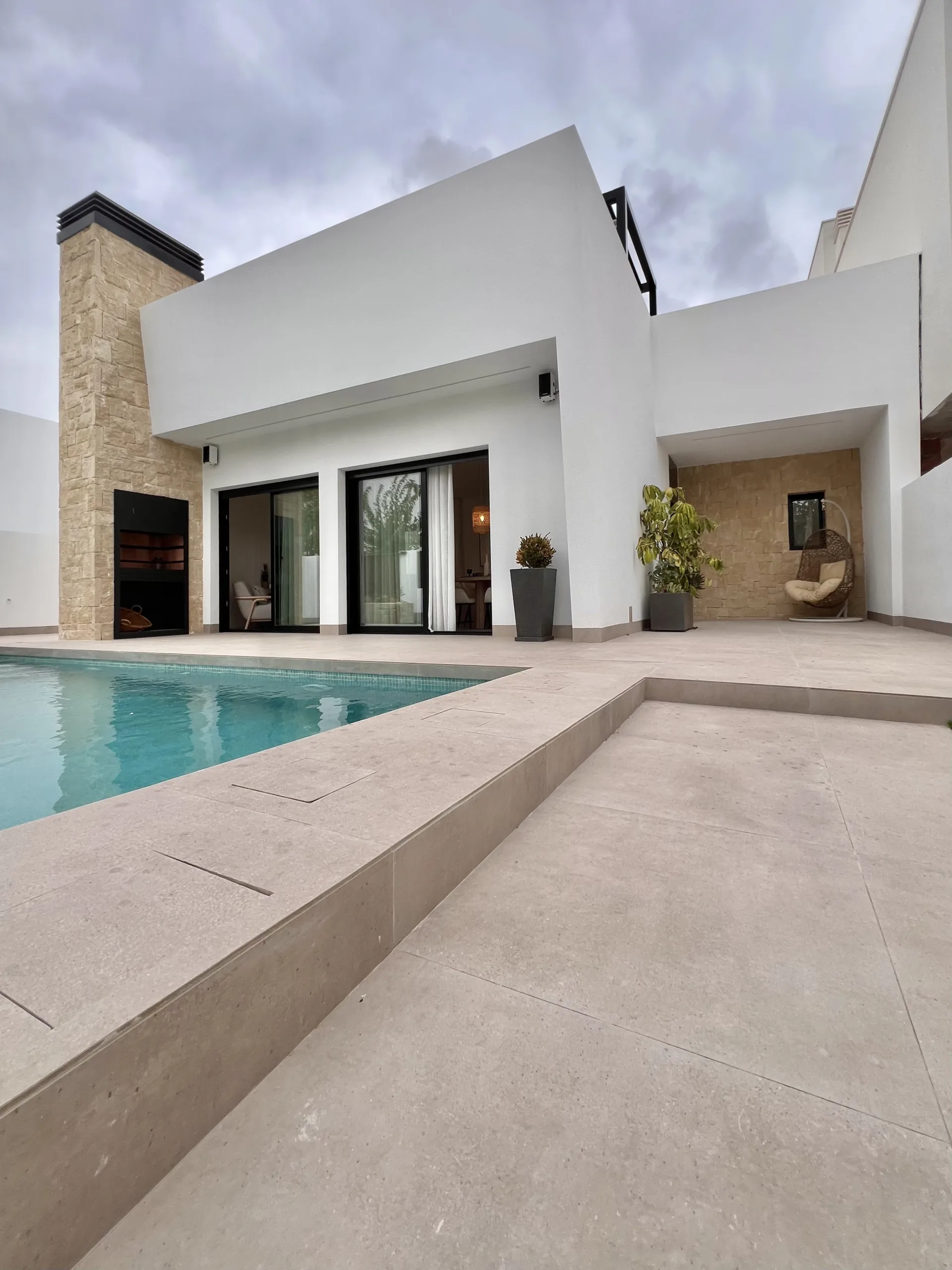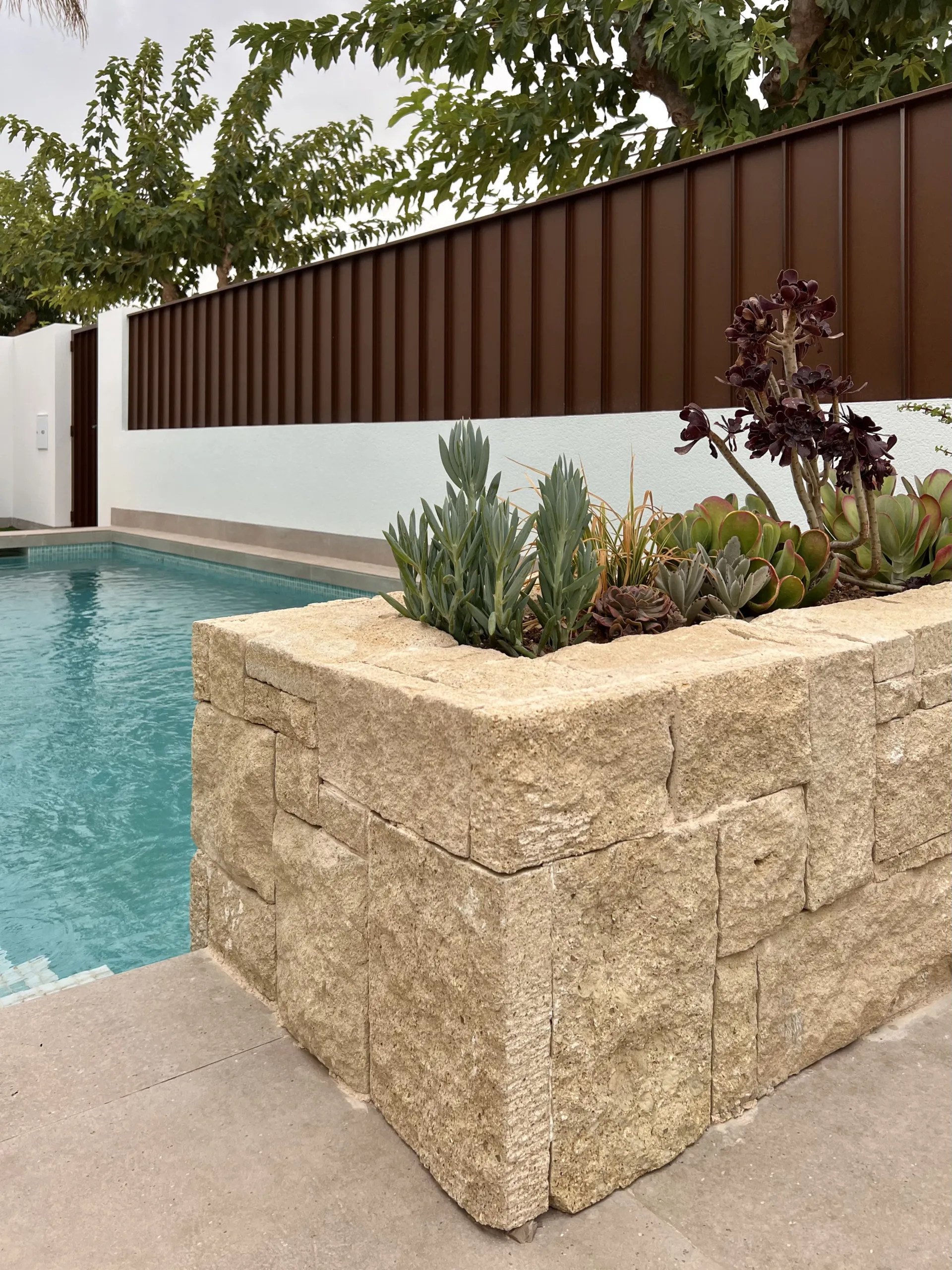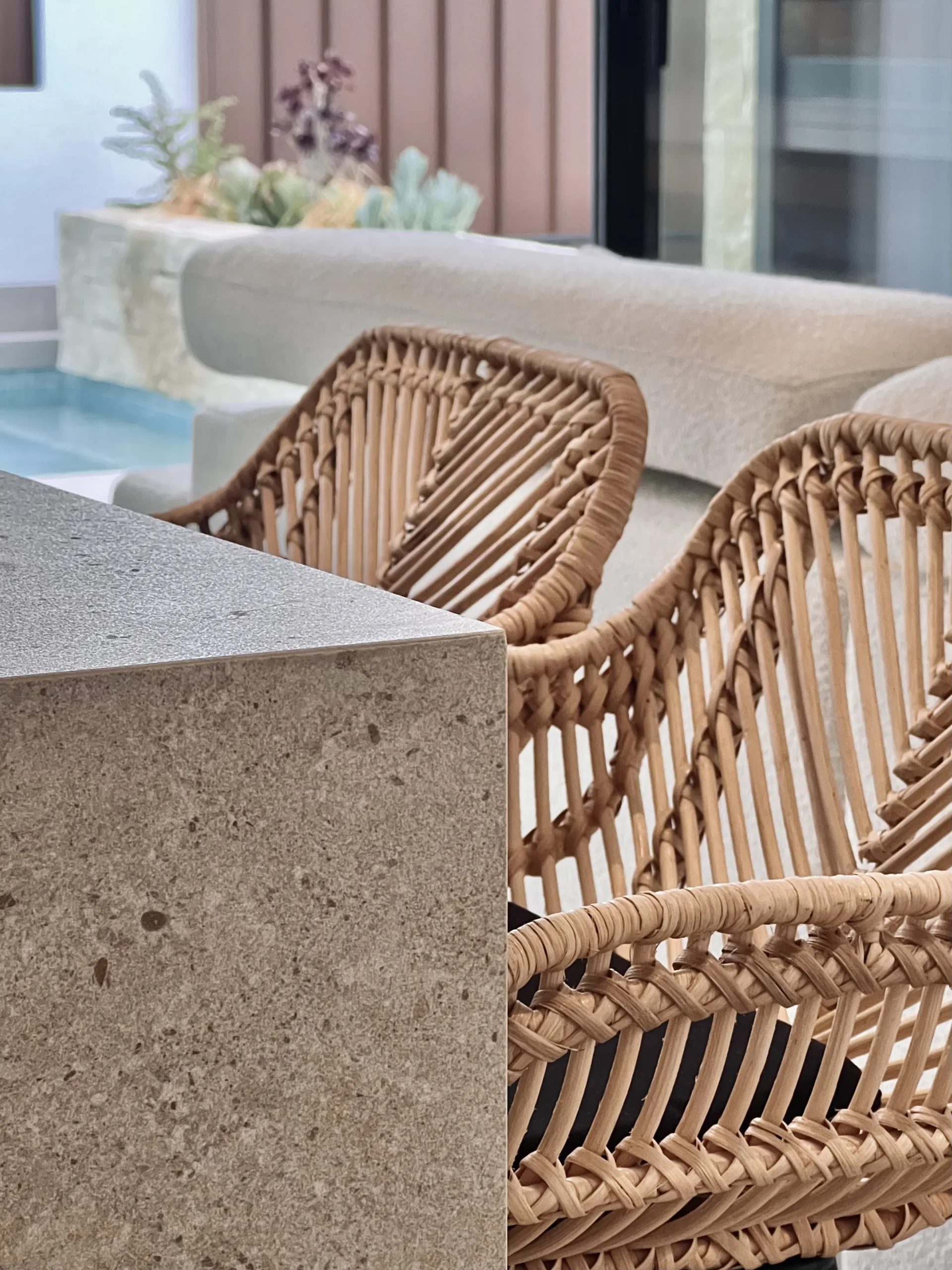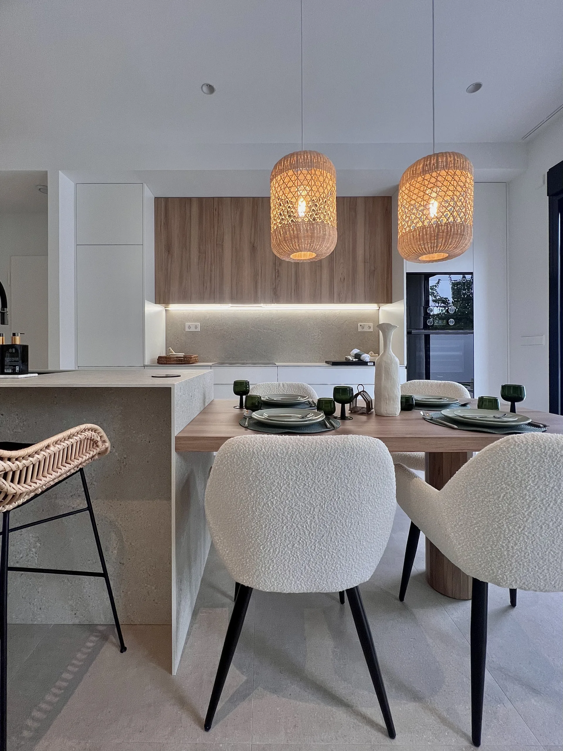 Cada villa se abre hacia una parcela amplia y privada, donde la piscina, la vegetación y los elementos pétreos componen un escenario íntimo y sofisticado. La casa se vive de dentro hacia afuera, y de fuera hacia dentro: cocinas con isla que se convierten en punto de encuentro, salones que dialogan con el paisaje y espacios exteriores que invitan a celebrar cada instante.