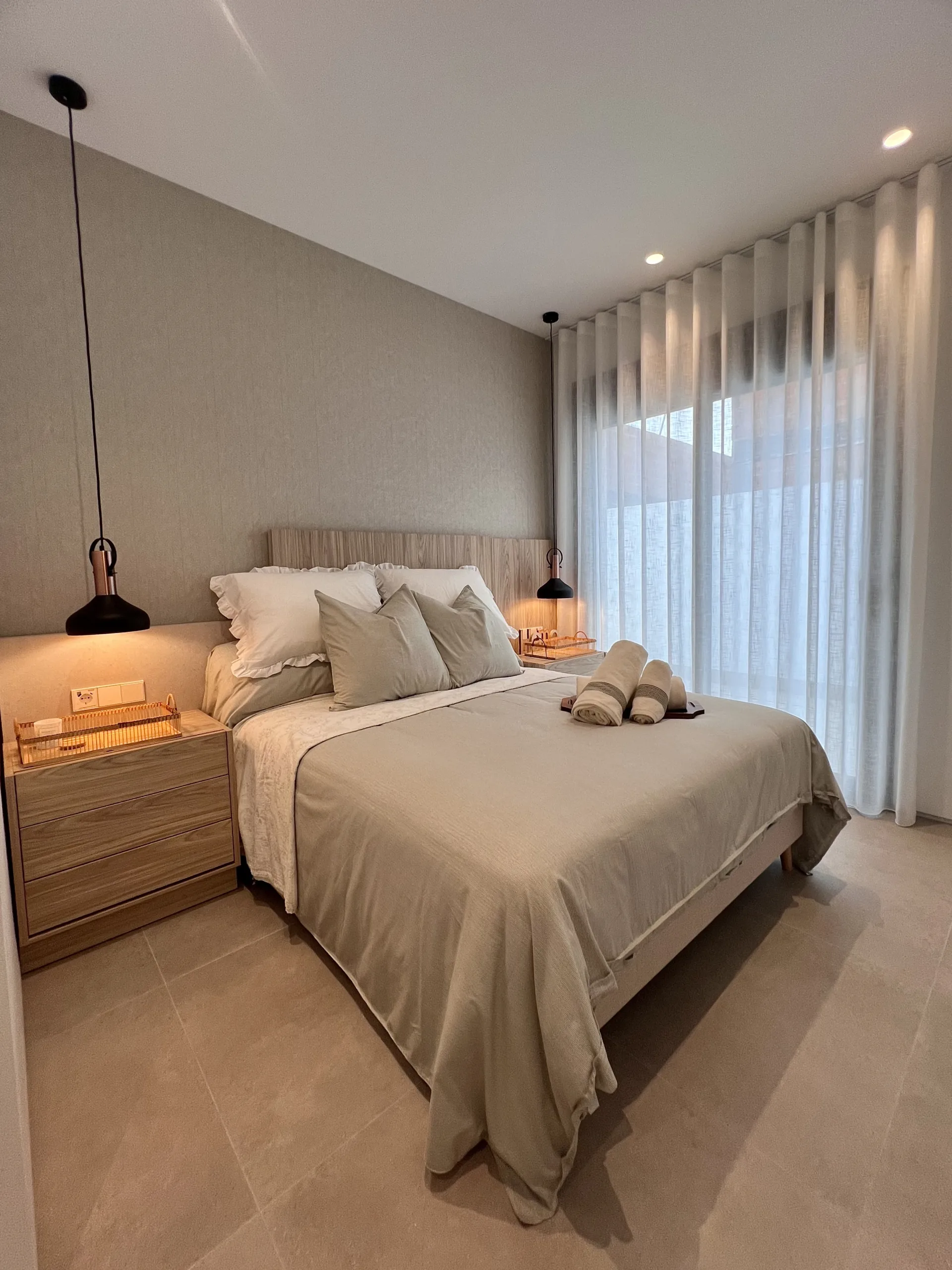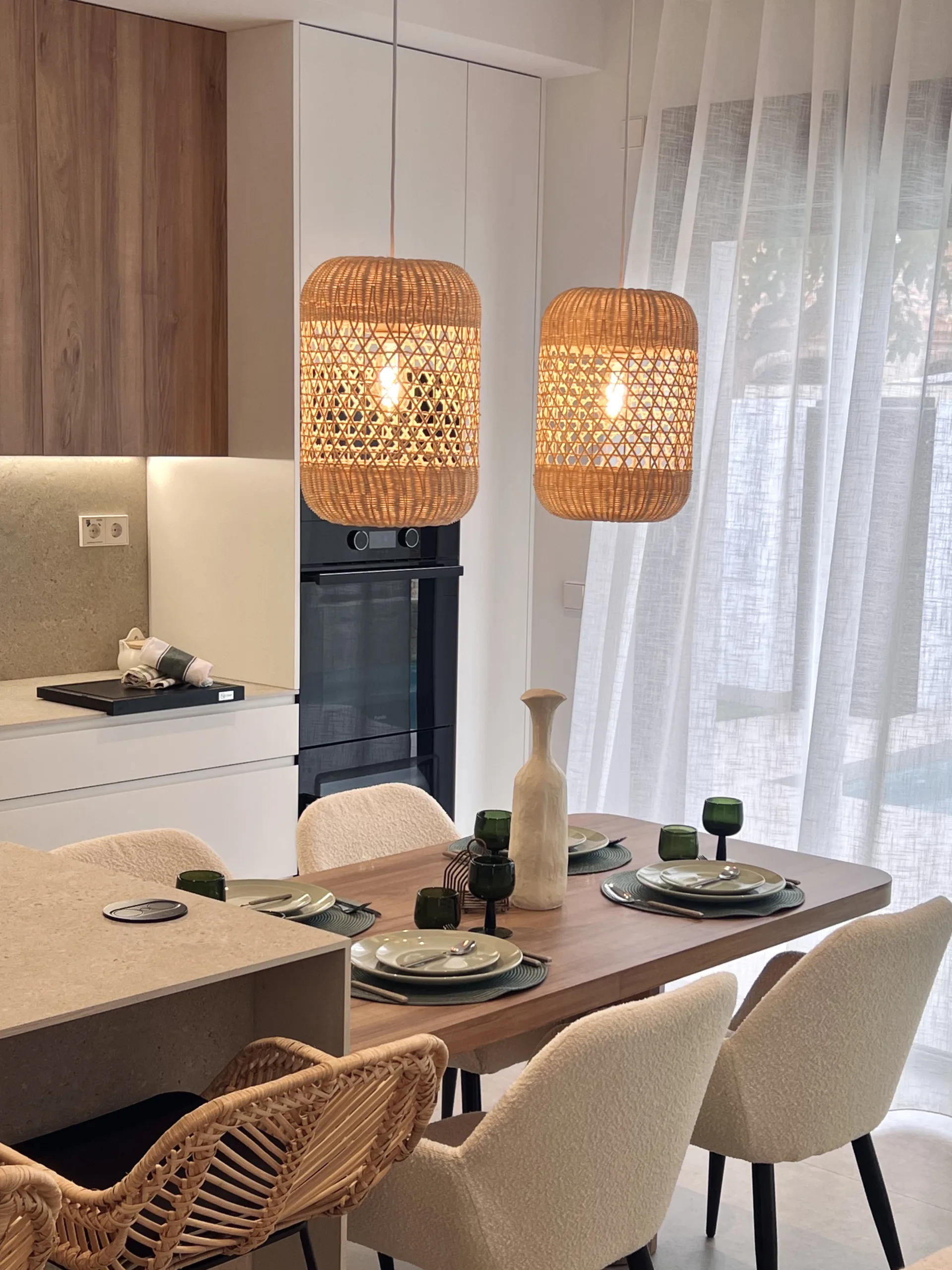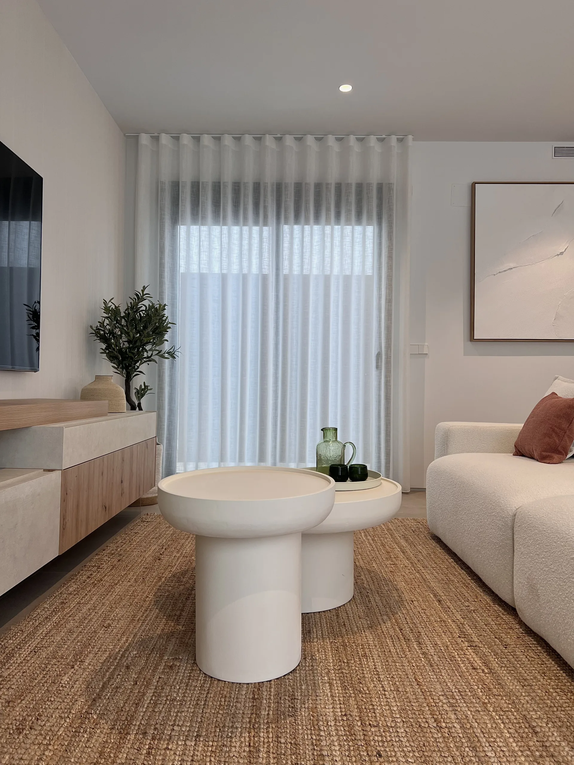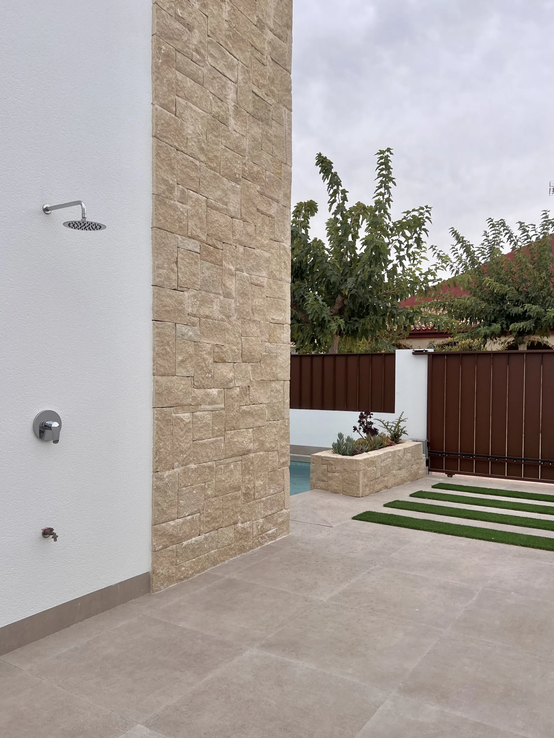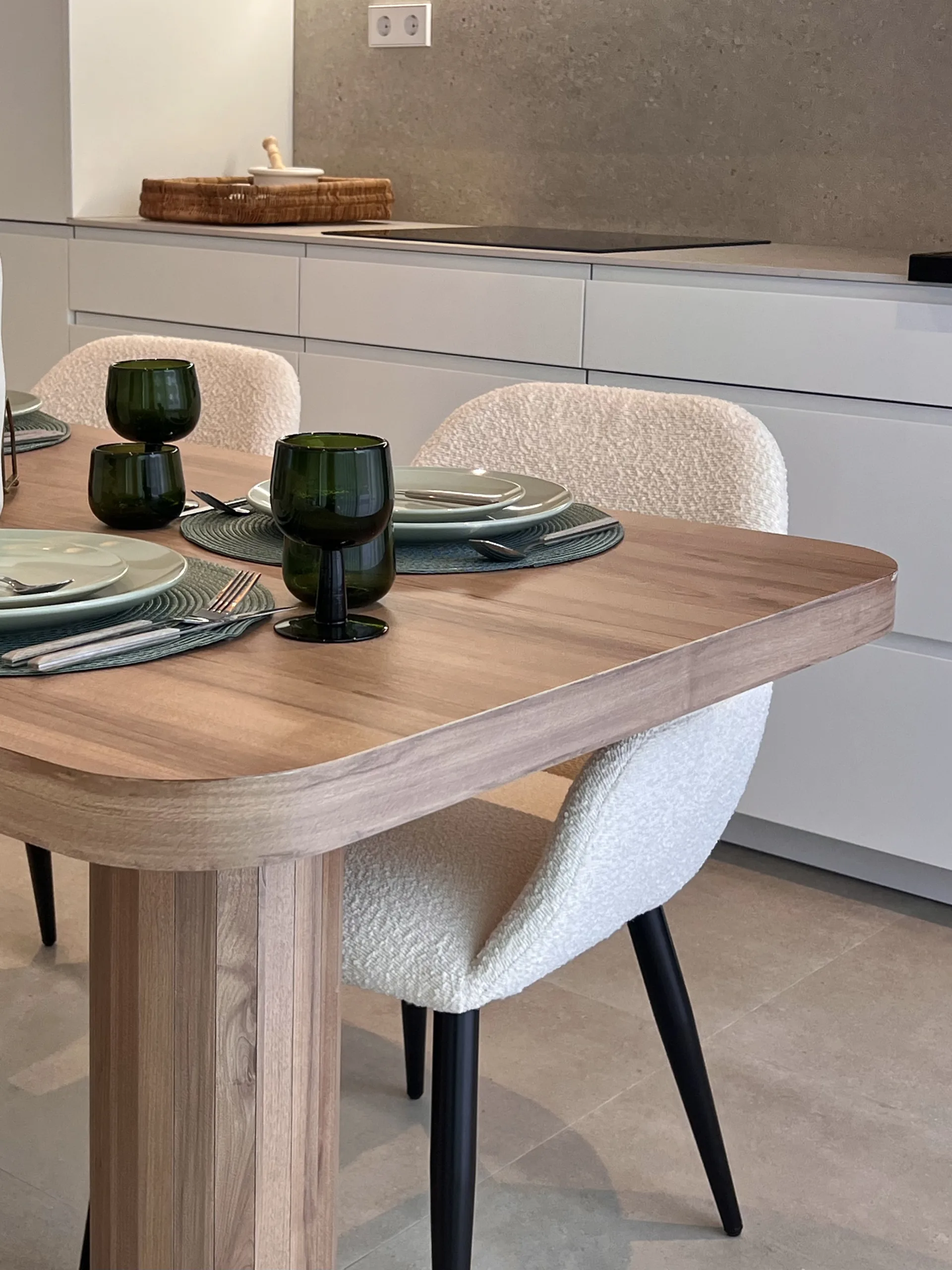 Cada villa se abre hacia una parcela amplia y privada, donde la piscina, la vegetación y los elementos pétreos componen un escenario íntimo y sofisticado. La casa se vive de dentro hacia afuera, y de fuera hacia dentro: cocinas con isla que se convierten en punto de encuentro, salones que dialogan con el paisaje y espacios exteriores que invitan a celebrar cada instante.